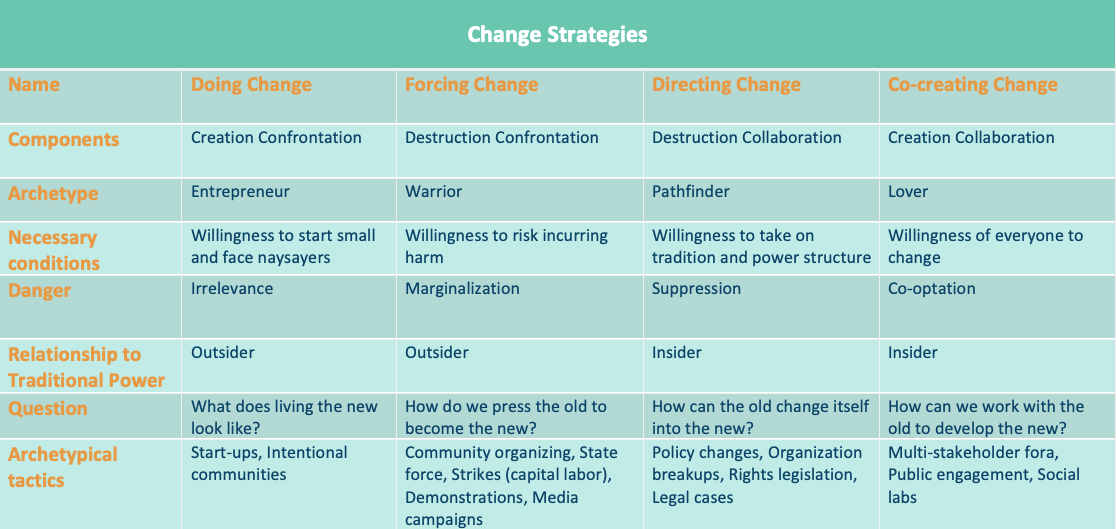 Often people are working for change with a similar desired outcome and vision, but get in conflict about what to do to realize it. Often the fight is over whether to take one of four generic strategies, when all the strategies are necessary. But how to collaborate between them is complex.