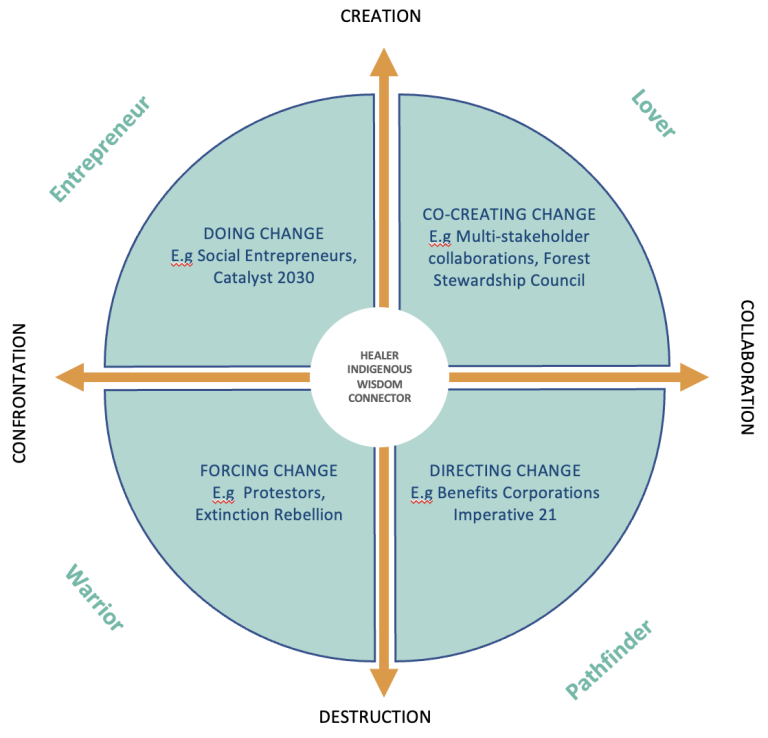 A second dynamic is the spectrum of confrontation to collaboration. The extreme of confrontation is war, but there are many less confrontational actions, such as those of Greenpeace activists. At the collaboration extreme, consider the facilitation of deep mutual respect and common commitment in a group that is working together to realize a change goal through transcendence of diverse perspectives, similar to the Forest Stewardship Council‘s work.
